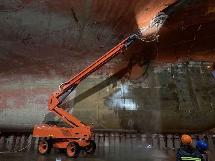 近期,以模塊化臂式平臺為基礎,鼎力船舶除銹噴涂機器人系列再添一員,且已正式服役于某船廠。